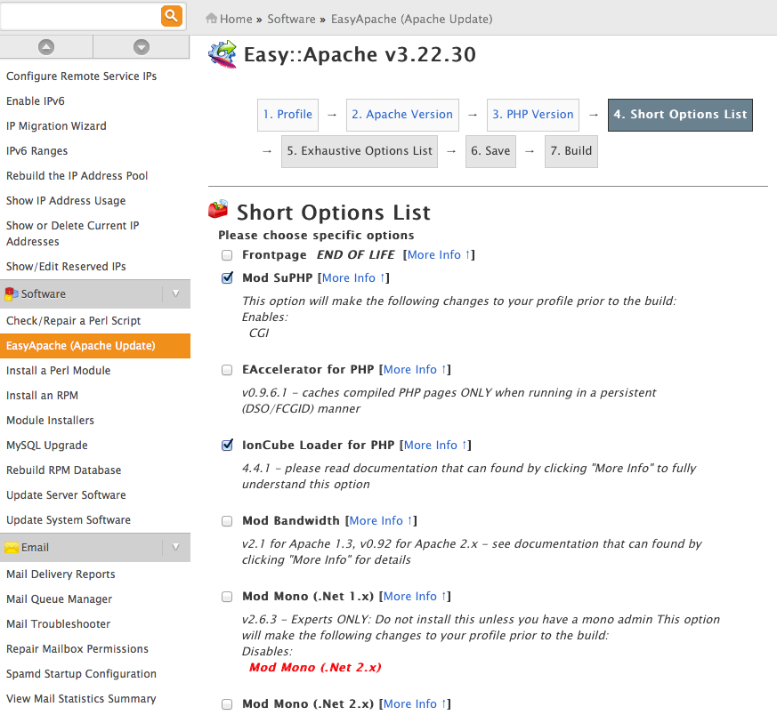 En el administrador WHM de CPanel podemos encontrar easyApache, una opción muy sencilla para añadir módulos a nuestro Apache. La podemos encontrar en el menú izquierdo del panel. Usando esta opción no tendremos que tener conocimientos de administración de sistemas para realizar modificaciones sobre el Apache instalado.