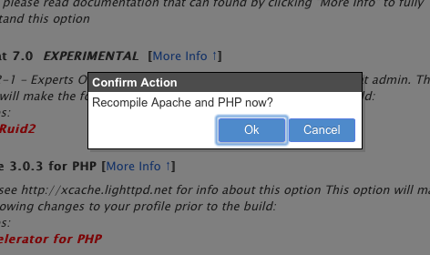 Nos preguntará "Recompile Apache and PHP now?" a lo cual deberemos responder "ok". Una vez hecho esto, puede que nos haga otras preguntas. A todas debemos de responder "ok" o, en su defecto, "I understand".