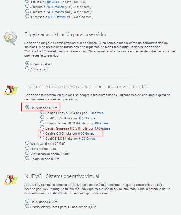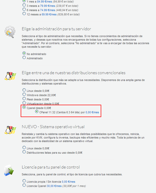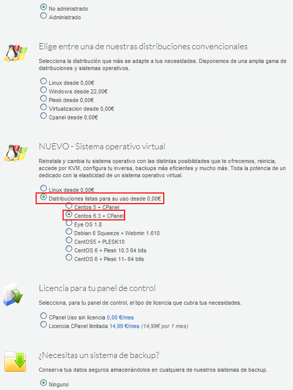 Puedes elegirlos a la hora de realizar tu contratación, seleccionando la opción "Centos 6.3 + CPanel", dentro de la sección "Distribuciones listas para su uso". Te mostramos un ejemplo en la contratación de un VPS: