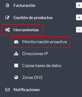 Tan solo tenéis que acceder a vuestra Extranet de Cliente y hacer clic en el enlace "Monitorización proactiva" dentro de la sección "Herramientas" del menú lateral izquierdo.