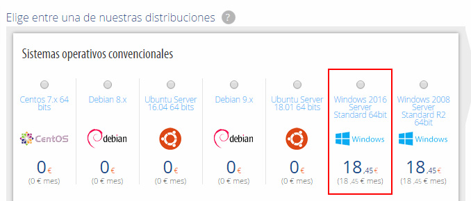 Si vas a contratar un nuevo servidor, y lo quieres con Windows Server 2016 instalado, tan solo tienes que seleccionarlo en los pasos de compra, al elegir la distribución para tu máquina.