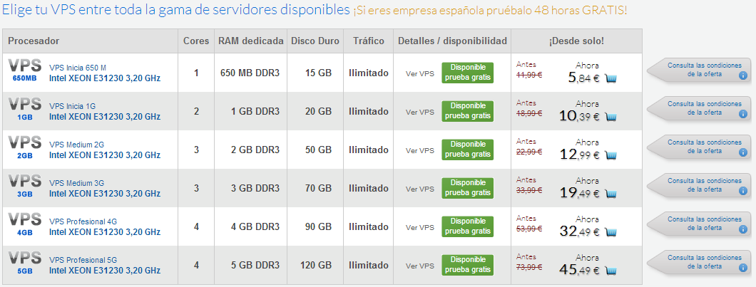 El servidor que antes costaba 11,99 €/mes ahora te saldría por 5,84 €/mes y, nuestro VPS más potente ha pasado de 73,99 €/mes a 45,99 €/mes.
