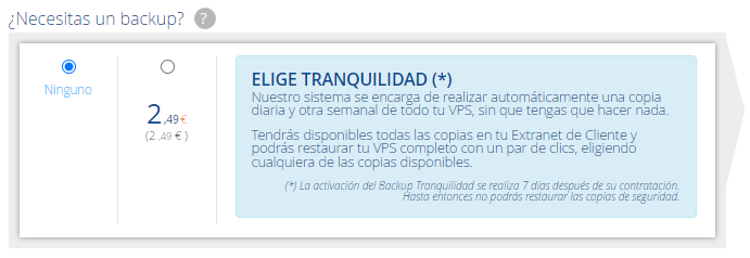 El Backup Tranquilidad está disponible al contratar un nuevo Servidor VPS HA, seleccionándolo en los pasos de compra.