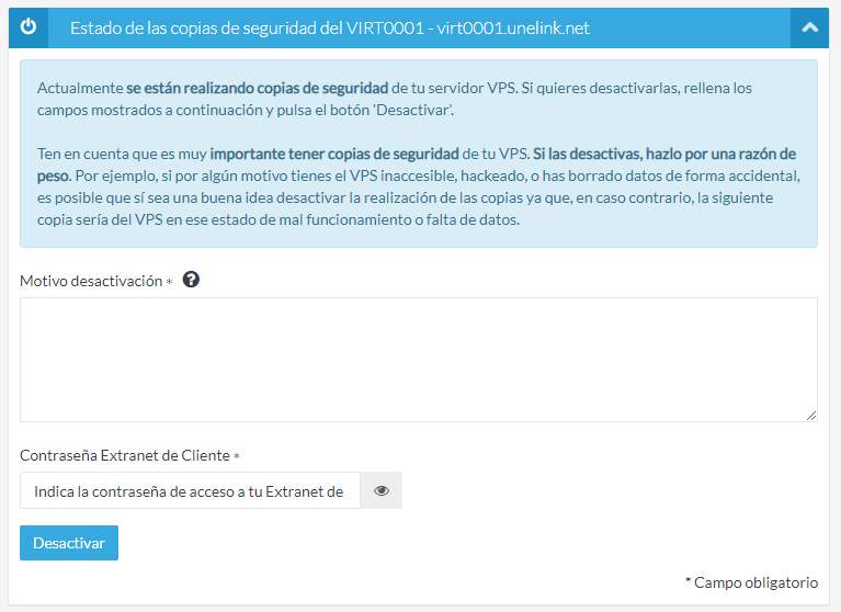 El sistema al realizar el backup hace una copia del virtual en el estado que se encuentre y comprobará que la copia se haya realizado correctamente. Por eso es muy importante que si has detectado algún problema en tu VPS, desactives la realización de backups hasta que el problema se solucione. Así dispondrás de backups realizados días antes del problema, que sabes que son correctos.