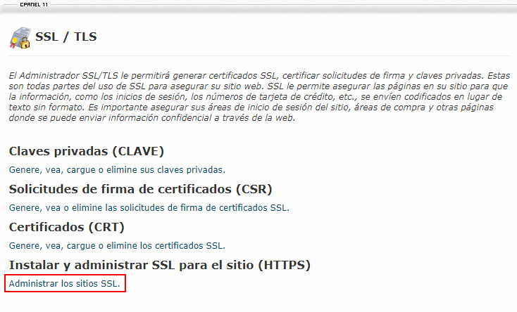 En la siguiente ventana, haz clic en el enlace "Administrar los sitios SSL" dentro de la sección "Instalar y administrar SSL para el sitio (HTTPS)".
