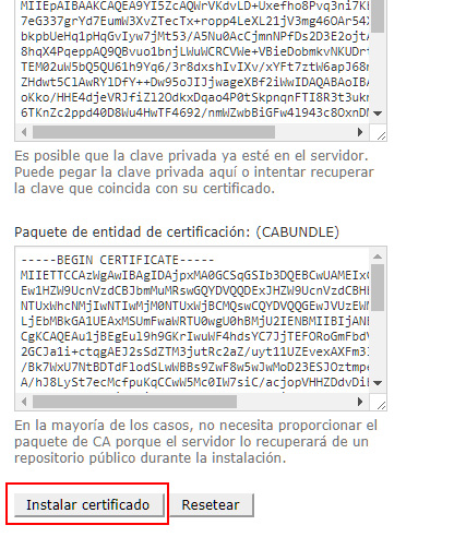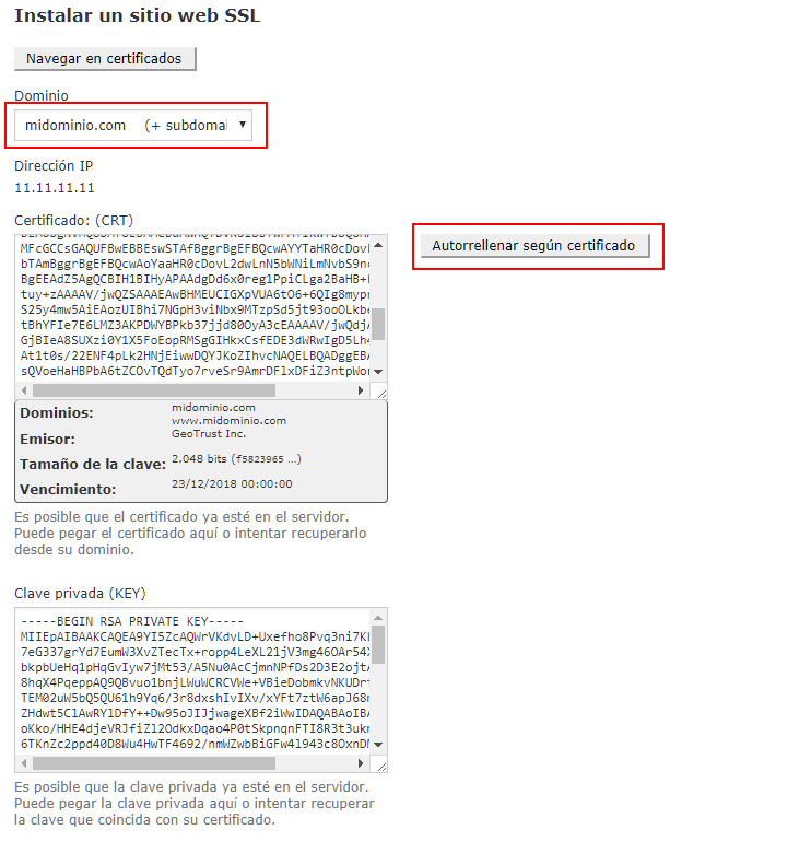 Tras pulsar el botón "Autorellenar según certificado", cPanel rellenará el resto de campos utilizando los datos del CRT. Para actualizar el certificado, tan solo tienes que pulsar el botón "Instalar certificado" que se encuentra en la parte inferior de la página.