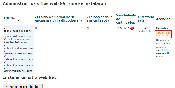 Dentro del administrador de sitios verás el certificado de tu dominio. Haz clic en el enlace "Actualice el certificado", situado en la columna "Acciones".