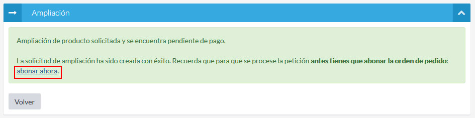 Una vez solicitada la ampliación, aparecerá una mensaje de confirmación desde la cual puedes abonar la orden de pedido generada para la ampliación.