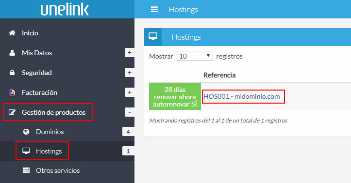 En el listado de hostings haz clic en la referencia del hosting que quieres ampliar.