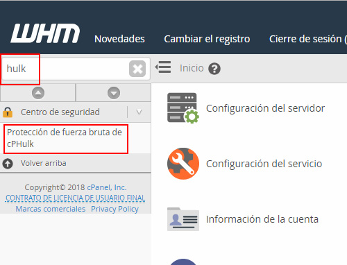 En el buscador principal, situado en la parte izquierda, busca cPHulk y haz clic en el enlace "Protección de fuerza bruta cPHulk".