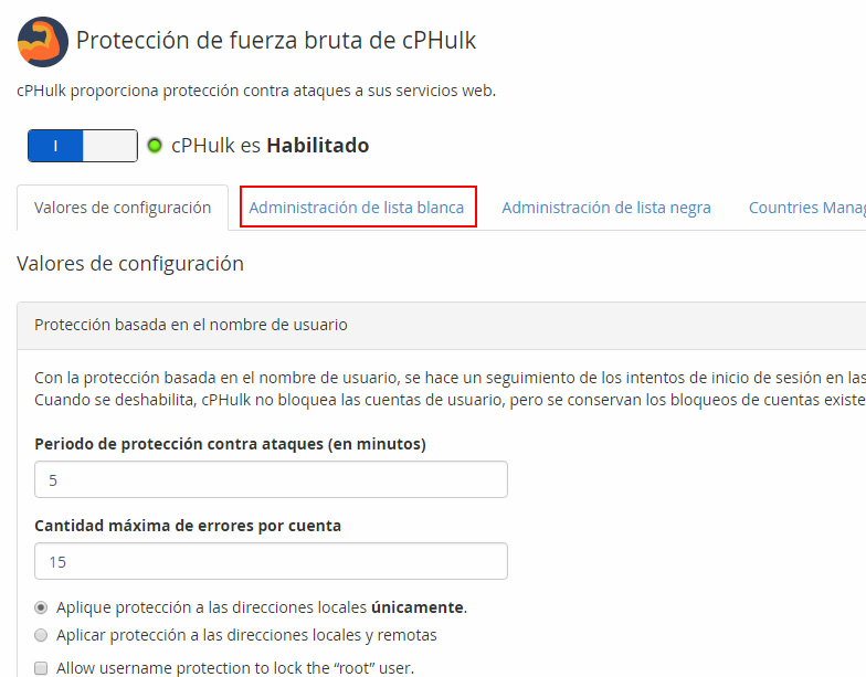 Dentro del panel de cPHulk, haz clic en la pestaña "Administración de lista blanca".