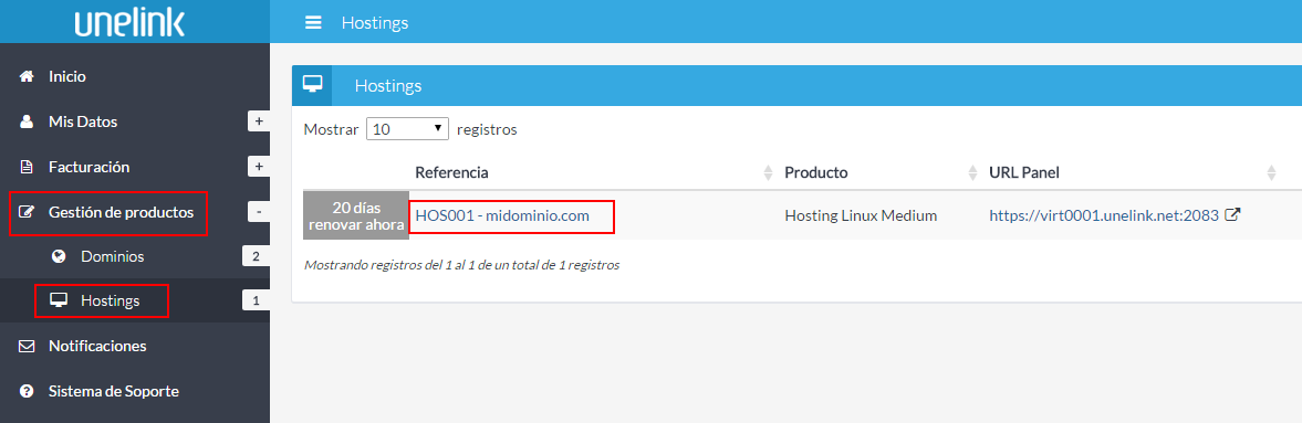 En Unelink hemos desarrollado una nueva herramienta para ayudarte en estos casos. Con ella puedes añadir tu IP a la lista blanca de cPanel y, de esta forma, trabajar de nuevo sin problemas. Para utilizar esta herramienta tan solo tienes que acceder a tu Extranet de Cliente, buscar el hosting afectado en el listado de hostings dentro de la sección "Gestión de productos" y hacer clic en la referencia.