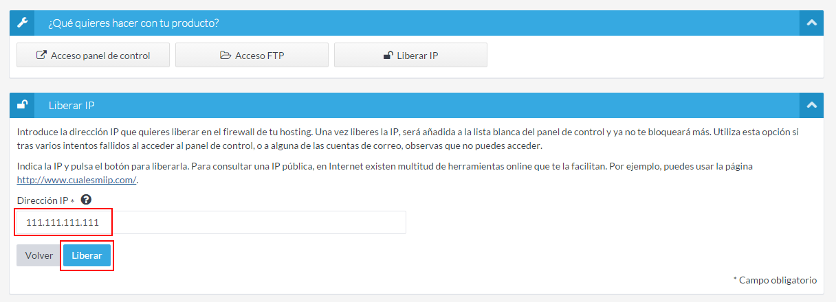 Pulsa el botón "Liberar" y la IP que hayas indicado se añadirá a la lista blanca del cPanel de tu hosting.
