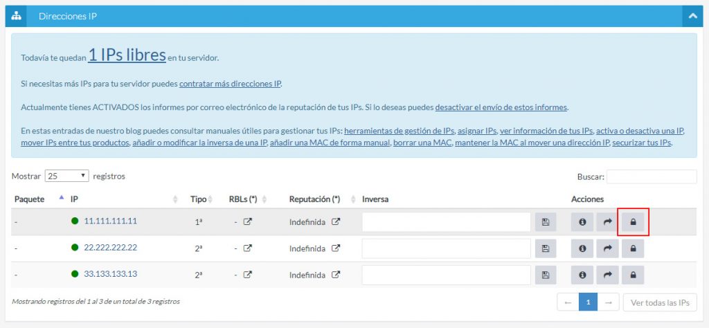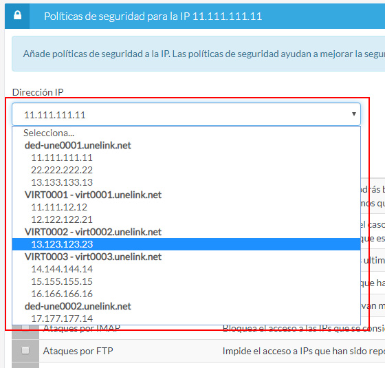 En este listado puedes ver todas las IPs que tienes repartidas entre tus servidores. Busca la IP en la que quieres activar políticas de seguridad y pulsa en el botón correspondiente.