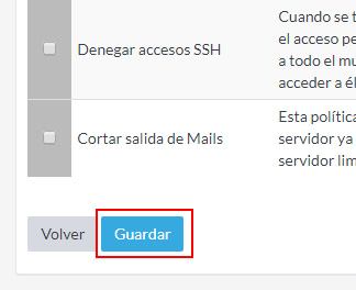 Si, por el contrario, quieres quitar una política de seguridad que ya tengas asignada a una IP, tan solo tendrás que desmarcar la política y pulsar el botón Guardar. La política se quedará marcada para ser eliminada y pasados unos minutos se hará efectivo el cambio.