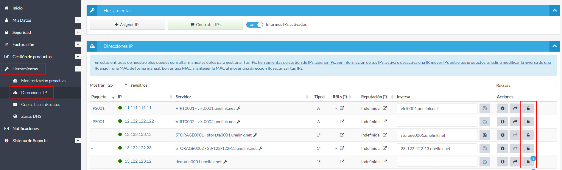 Para ello haz clic en el enlace Direcciones IP dentro del apartado Herramientas del menú principal de tu Extranet de Cliente.