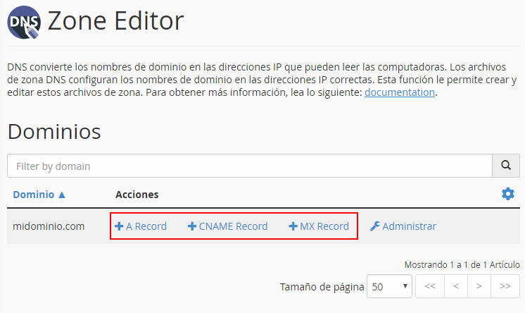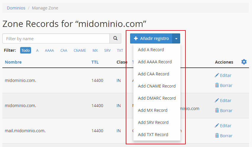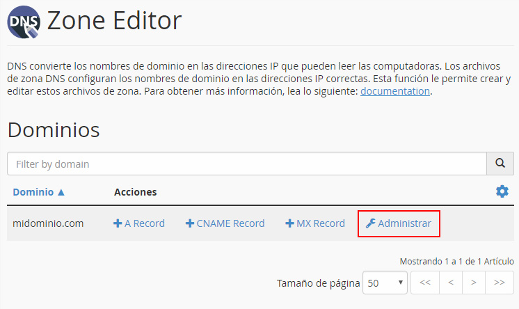 Si quieres modificar el valor de un registro que ya tengas creado, en la tabla con el dominio, haz clic en el enlace "Administrar".