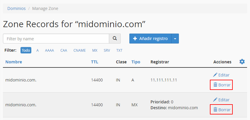 Si lo que quieres es borrar un registro DNS, localiza el registro en la tabla y haz clic en el enlace "Borrar".