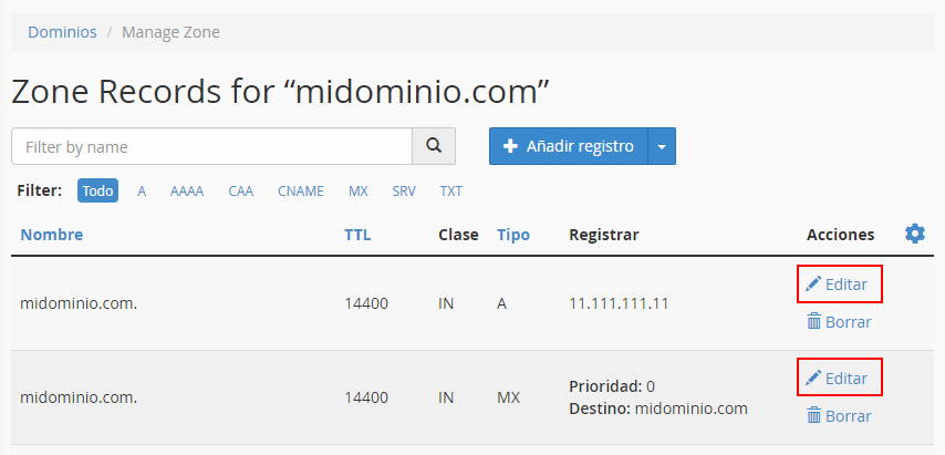 En la siguiente pantalla tienes todos los registros DNS creados en el dominio. Localiza el que quieras modificar y haz clic en el enlace "Editar". Cambia los valores y guarda los cambios.