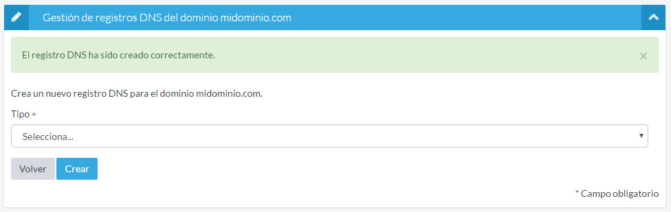 Una vez pulsado el botón "Crear" se creará un registro de tipo AAAA para tu dominio que apuntará a la IPv6 que hayas indicado.