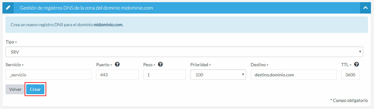 Selecciona el tipo de registro SRV, rellena todos los campos y pulsa Crear.