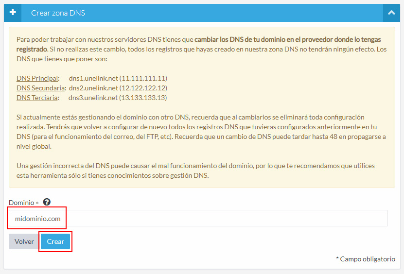 Añade el dominio para el que quieres crear los registros. Recuerda que para que funcione la gestión DNS, tienes que modificar los DNS principales en tu proveedor de dominios para que apunten a nuestros servidores.