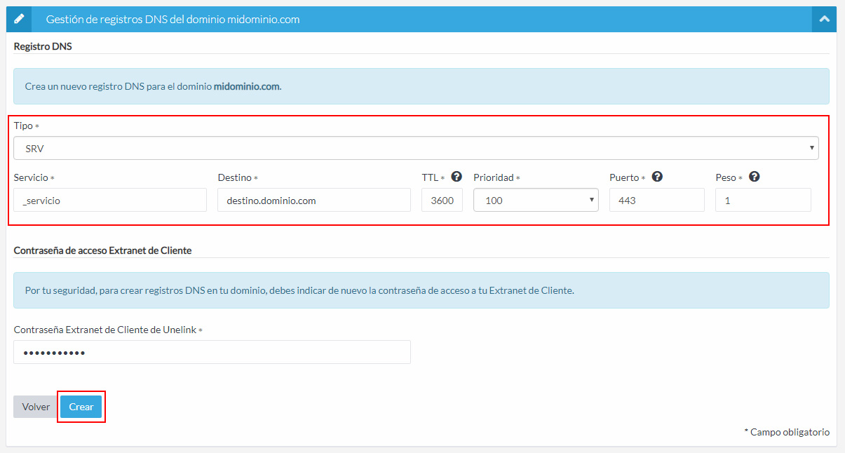 En el tipo de registro selecciona SRV e indica todos los valores que quieres para tu registro, así como la contraseña de acceso a tu Extranet de Cliente, necesaria por seguridad. Por último, pulsa el botón Crear.