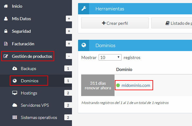 Haz clic en la opción Dominios dentro del apartado Gestión de productos, busca el dominio para el que quieres gestionar los DNS y haz clic en su nombre.