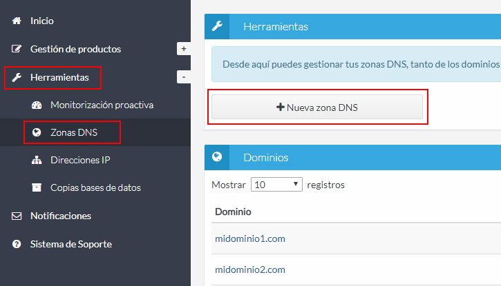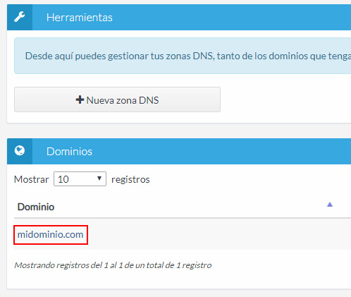 Para gestionar los registros DNS de estos dominios haz clic en la opción Zonas DNS dentro de la sección Herramientas.