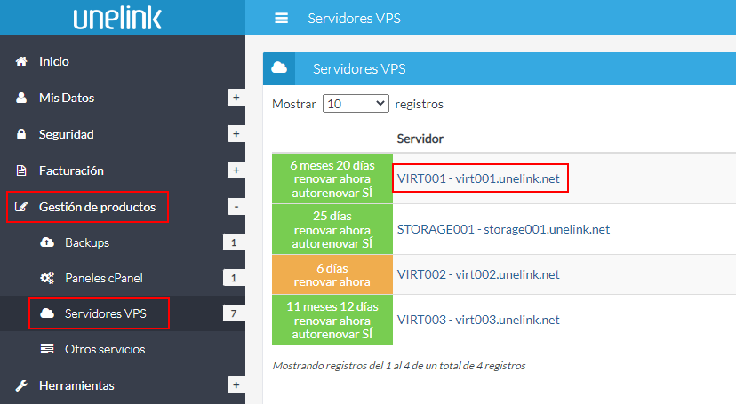 En el listado de VPS, busca el servidor al que quieres añadir un disco secundario y haz clic en su referencia.