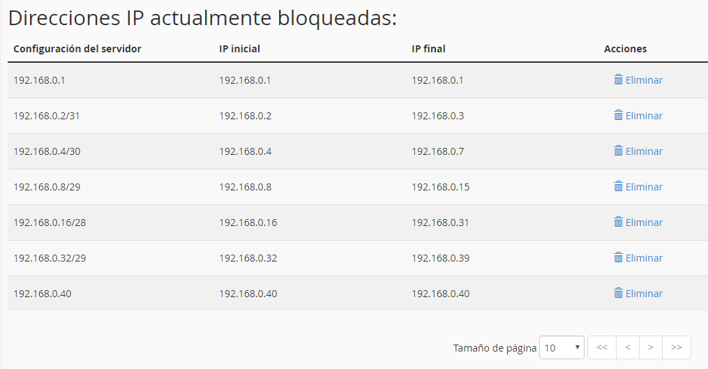Las IPs bloqueadas aparecen en el listado inferior.