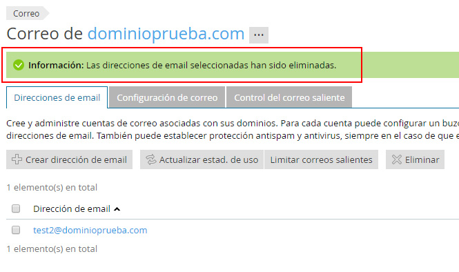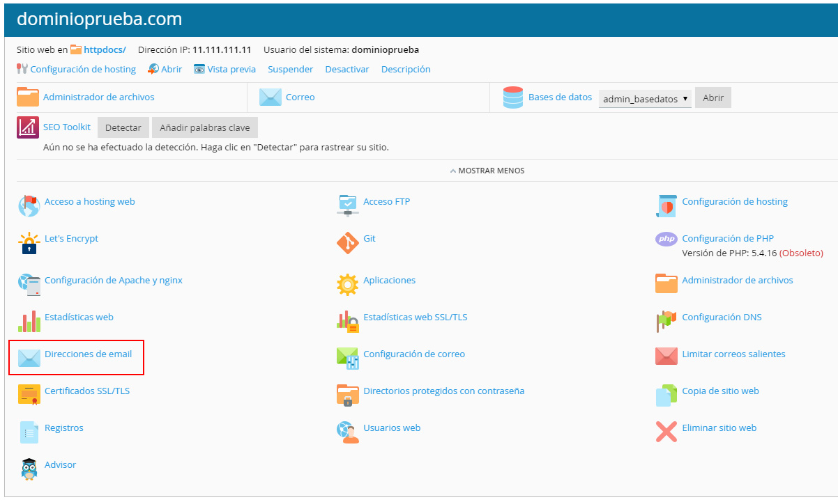 Dentro del panel haz clic en el enlace Direcciones de email dentro de las herramientas de configuración del dominio en el que se encuentra configurado el mail que quieres borrar.