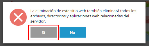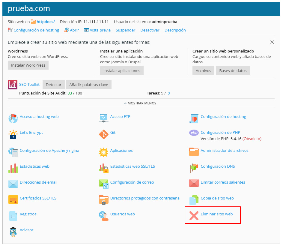 En las herramientas del dominio haz clic en Eliminar sitio web.