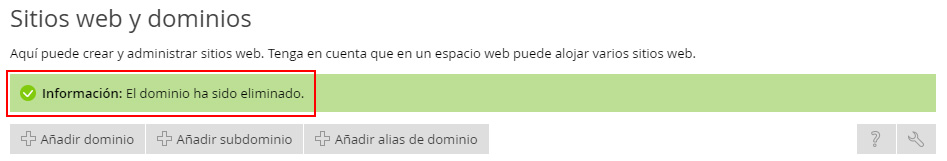 Una vez confirmado el borrado, se eliminará el dominio y todo su contenido.