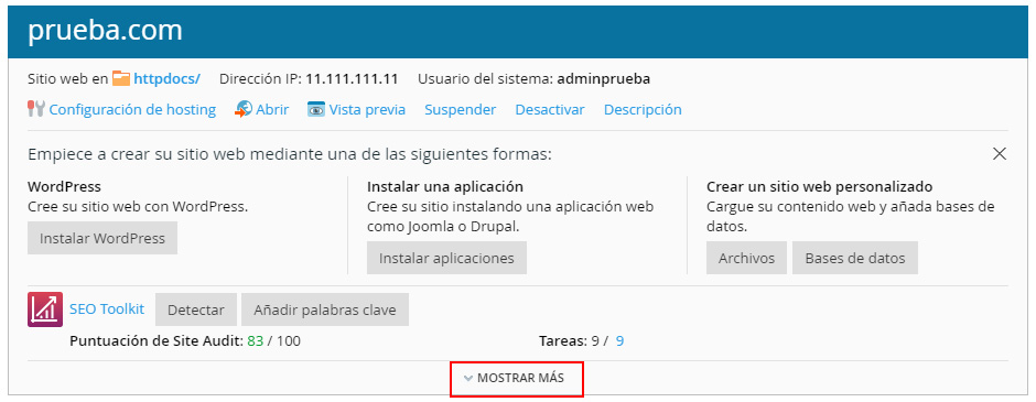 En el listado de dominios busca el que quieres eliminar. Si no se muestran las herramientas del dominio haz clic en el enlace Mostrar más para que se aparezcan.