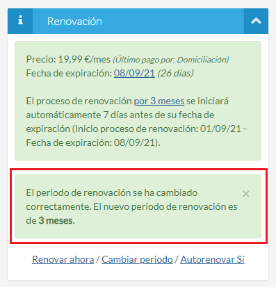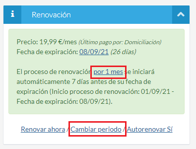 En el apartado Renovación, situado en la parte derecha, puedes ver la fecha de expiración del producto, así como el periodo de renovación. Para indicar otro, haz clic en el periodo o en el enlace Cambiar periodo.