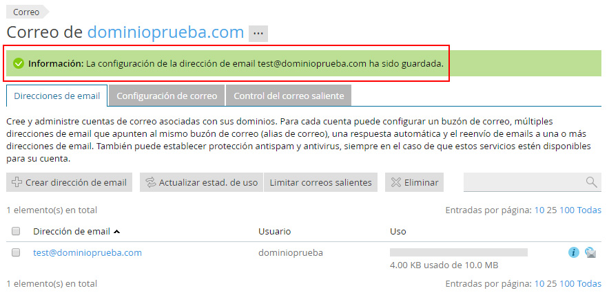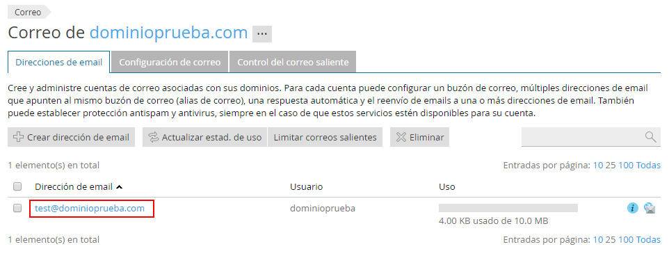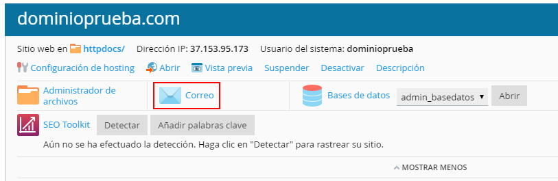 Busca el dominio donde está creada la cuenta de mail y haz clic en el enlace Correo.