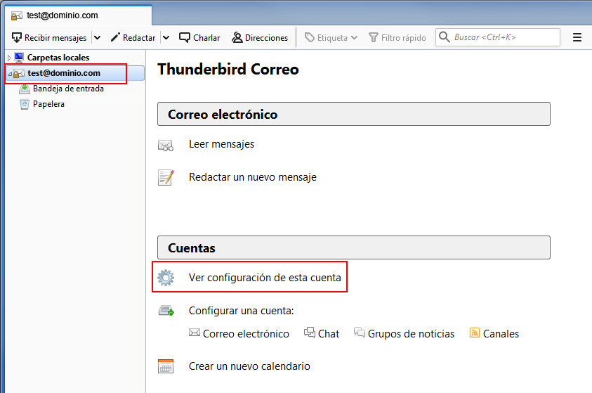 Vamos a ver cómo ajustar esta característica. Lo primero que tienes que hacer es hacer clic en la cuenta de correo, situada en la parte superior izquierda de la ventana principal de Thunderbird. Después pulsa en Ver configuración de esta cuenta.