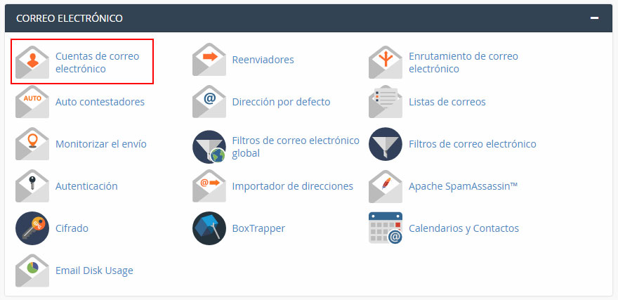 Accede al listado de cuentas de correo haciendo clic en el enlace "Cuentas de correo electrónico" dentro del apartado "Correo electrónico".