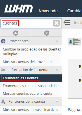 Una vez dentro del WHM, en el menú de la izquierda busca la palabra "cuentas" y haz clic en la opción "Enumerar las cuentas".