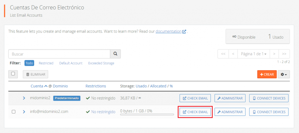 En el listado de cuentas de correo, busca la cuenta a la que quieres acceder y pulsa el botón Check Email.