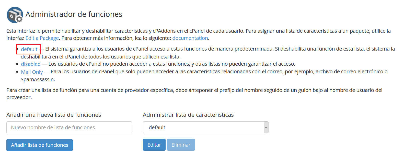 Una vez dentro del Administrador de funciones, hacemos clic en default para modificar las funciones que tienen disponibles los usuarios comunes.