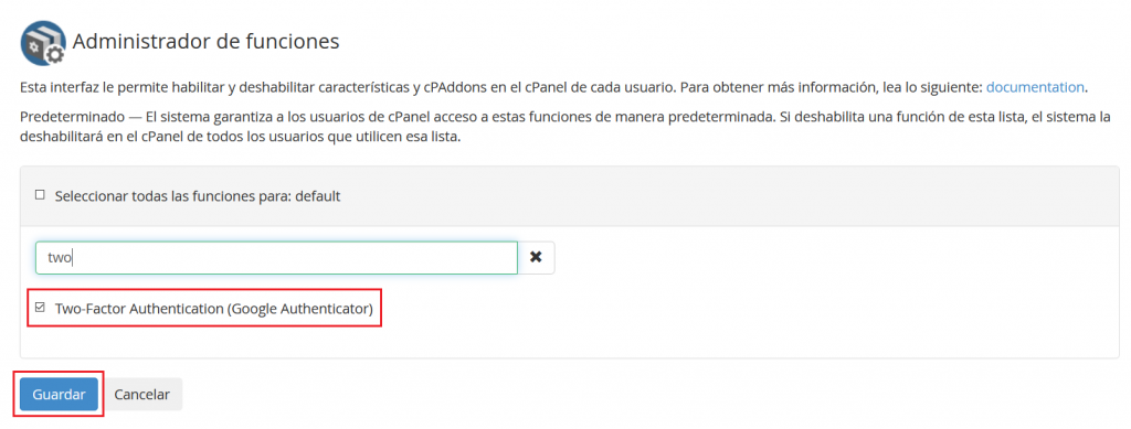 Para empezar a utilizarlo, accede a la cuenta de cPanel para la que quieres iniciar con el sistema de dos factores.