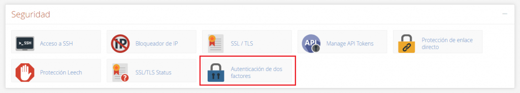 En las herramientas de cPanel, buscamos la sección Seguridad hacemos clic en Autenticación de dos factores.
