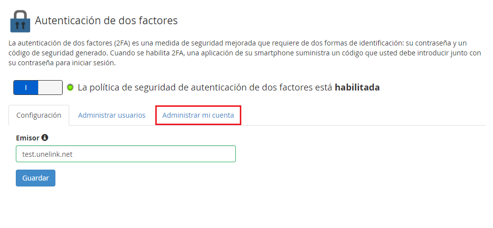 Primero debemos acceder al panel WHM y habilitar la extensión de autenticación en dos pasos.