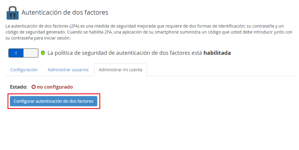 Desde aquí podemos activar la autenticación en dos factores para nuestra cuenta, para ello debemos hacer clic en el botón "Configurar autenticación de dos factores".