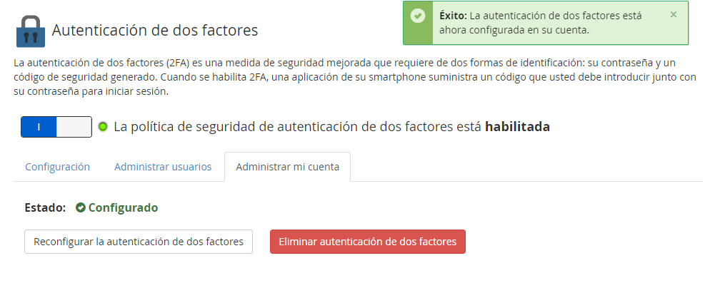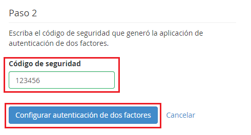 Una vez instalada, escaneamos el QR con la aplicación, posteriormente, introducimos el código de seguridad que nos genere la aplicación en WHM y hacemos clic en el botón Configurar autenticación de dos factores.