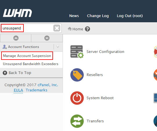 Una vez estéis dentro del panel, escribid "unsuspend" en el buscador de la izquierda y pulsad en el enlace "Manage Account Suspension" (los textos pueden variar dependiendo del idioma configurado).