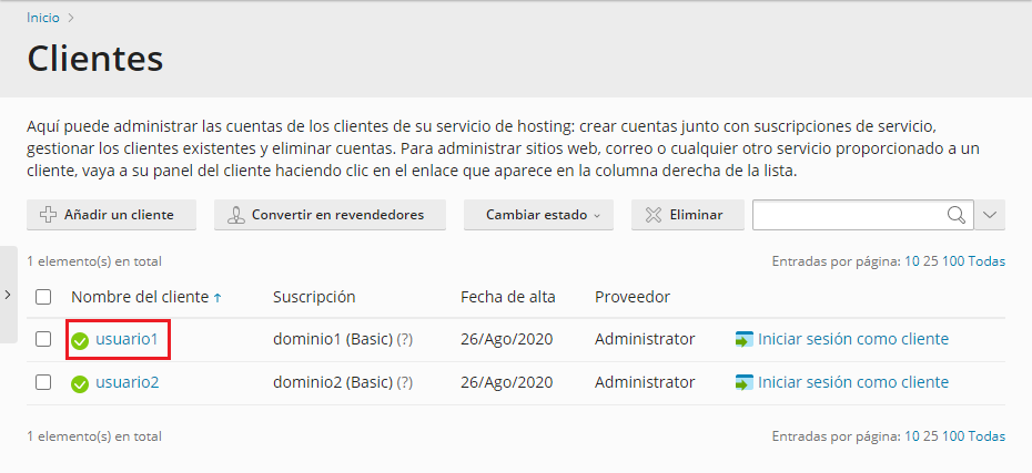 Aparecerá un listado con las distintas cuentas que hay creadas en Plesk.