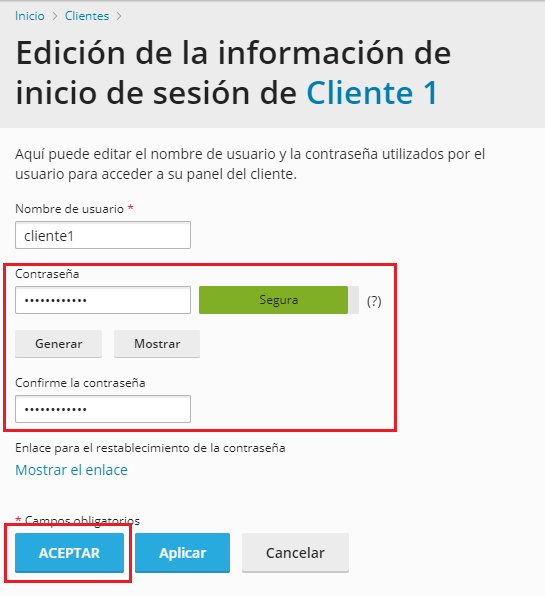 Nos aparecerá un formulario para cambiar el nombre de usuario y la contraseña del usuario, escribimos la contraseña nueva y hacemos clic en "ACEPTAR".